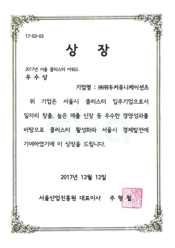 서울클러스터 어워드 우수상 페이지 정보 작성자 WeDu 댓글 0건 조회 6,157회 작성일 19-05-30 19:34 본문 2017-12-12 우수상 17-52-02 서울클러스터 어워드 서울산업진흥원 대표이사 주형철 List Previous서울특별시장 표창장 19.05.30 Next산업통상자원부 표창장 19.05.30