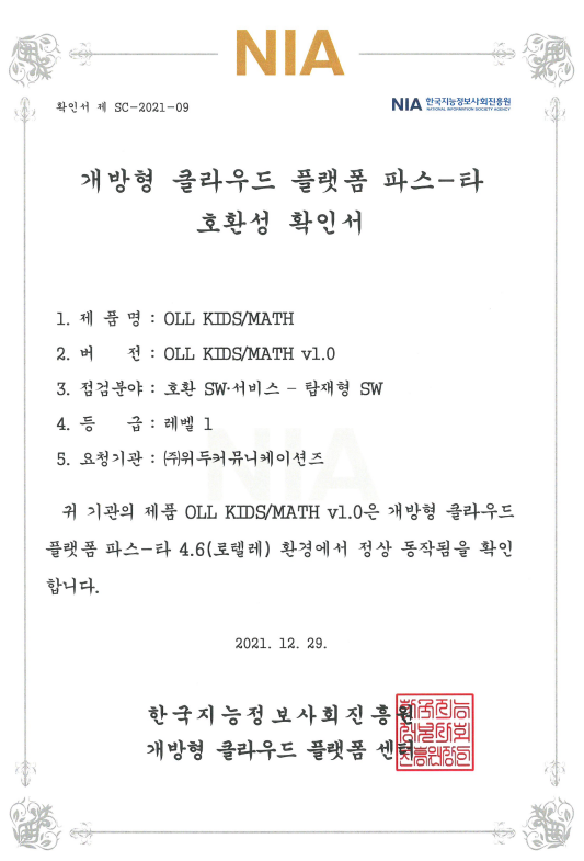 [한국/확인서] OLL KIDS/MATH 파스-타 호환성 확인서 페이지 정보 작성자 WeDu 댓글 0건 조회 8,631회 작성일 21-12-31 12:48 본문 2021-12-29 확인서 제 SC-2021-09 점검분야 : 호환 SW서비스 - 탑재형 SW List Next[한국/인증서] OLL KIDS/MATH 클라우드 서비스 확인서 21.12.31