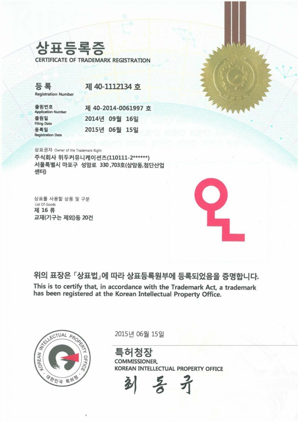 [한국/상표] OLL 16류 페이지 정보 작성자 WeDu 댓글 0건 조회 5,306회 작성일 19-05-30 18:59 본문 2015-06-15 상표 제 40-1112134호 16류 List Previous[한국/상표] OLL 41류 19.05.30 Next[한국/상표] OLL 09류 19.05.30